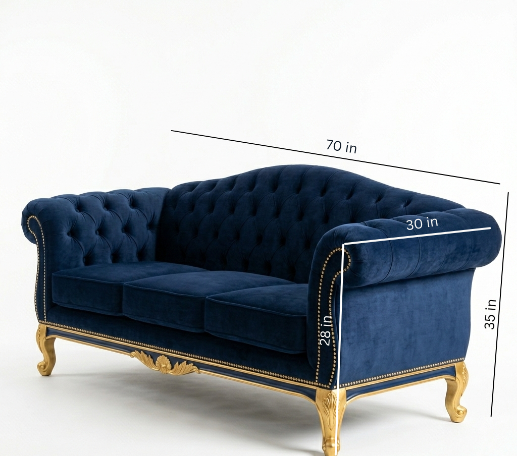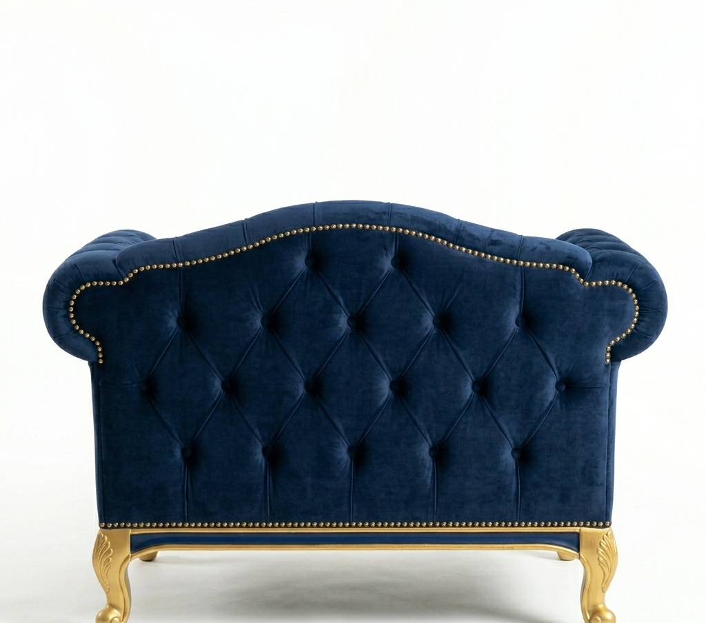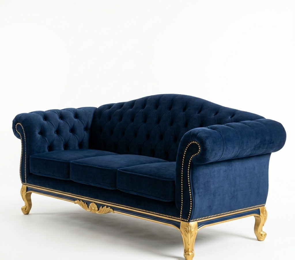 This is the Windsor Grand Chesterfield, a luxurious statement piece that blends classic British silhouettes with opulent, French-inspired detailing. Wrapped in a deep royal blue velvet, this sofa is designed to be the focal point of a sophisticated living room or a grand study.